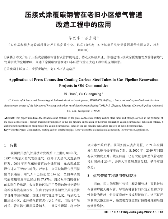 本文介紹了壓接式涂覆碳鋼管材及管件的構(gòu)造、特點(diǎn)及壓接原理,并通過對(duì)壓接式涂覆碳鋼管及管件在燃?xì)夤艿李I(lǐng)域的應(yīng)用跟蹤,闡述了涂覆碳鋼管在老舊小區(qū)燃?xì)夤艿栏脑旃こ讨械膽?yīng)用前景。