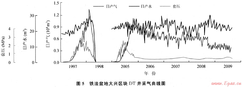鐵法盆地大興區(qū)塊DT井為直井,1996年12月投產,日產氣最高1.35×104m3,平均日產水21.8m3,生產15個月后關井,2004年重新開井,穩(wěn)產4a遞減,目前日產氣0.5×104m3,已累計采出1017×104m3,劃分為上升-穩(wěn)產-遞減3個階段(圖5),即阻礙-暢通-低飽和3個解吸階段。