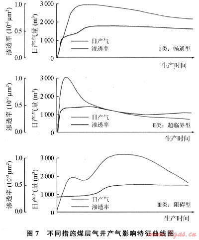 暢通型解吸:降壓速率接近解吸速率,日產氣上升-相對穩(wěn)產-遞減;滲透率隨開采的束縛水、氣產出上升-穩(wěn)定,開采效果最佳(圖7)。