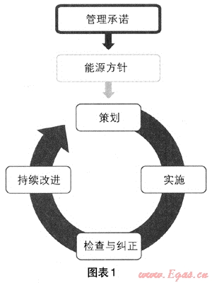 用能企業(yè)是實(shí)現(xiàn)能源節(jié)約的核心。在以節(jié)能減排為重要目標(biāo)的指引下,企業(yè)使用任何能源,都應(yīng)制定一個(gè)基本的控制程序,形成一個(gè)有效能源管理體系運(yùn)行模式。企業(yè)為兌現(xiàn)管理承諾和實(shí)現(xiàn)能源方針應(yīng)進(jìn)行策劃-實(shí)施-檢查與糾正-持續(xù)改進(jìn)(PDCA)等過程。圖示如下(圖表1):