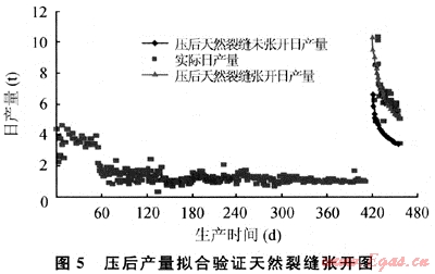 由圖4可知,一旦微裂縫張開,壓后累積產(chǎn)量就增加明顯,而且累積產(chǎn)量隨裂縫張開面積的增加而極為明顯地增加,產(chǎn)量與微裂縫張開面積密切相關(guān),因此有必要提高施工砂液比,甚至采取縫內(nèi)暫堵技術(shù)來(lái)大幅度的提高縫內(nèi)凈壓力,盡可能使更多天然微裂縫張開,這是該油氣田高砂液比和縫內(nèi)暫堵壓裂取得好的效果的原因,相信也是開發(fā)這類低滲透油氣田的關(guān)鍵所在。