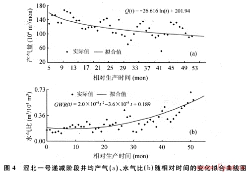 對(duì)澀北一號(hào)氣田遞減階段的井均日產(chǎn)氣量、氣水比隨相對(duì)生產(chǎn)時(shí)間的變化關(guān)系進(jìn)行回歸,得到如下關(guān)系式(圖4)。