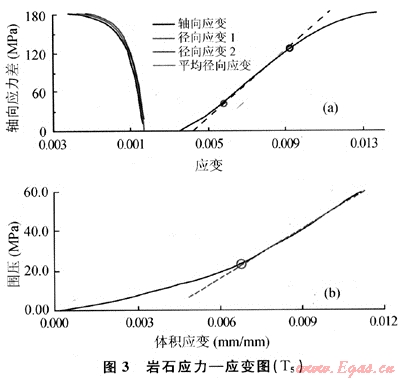 圖3是采用三軸巖石力學測試系統(tǒng)得到的巖石應力-應變關系曲線。從圖3-a可以看出:在應力增大的初始階段,巖石發(fā)生的變形較大,有一定軟塑性變形,隨著軸向應力增大(超過30MPa),逐漸過渡到穩(wěn)定的彈性變形階段,超過彈性極限后,巖石進入塑性變形階段,最終破壞失穩(wěn)。從圖3-b則可以更明顯地看出巖石在圍壓增大的初始階段變形較大,整個變形過程不是線彈性變形過程。