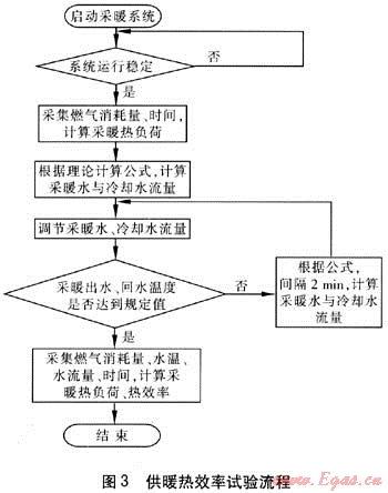 為了進一步說明系統(tǒng)軟件設計過程,下面以供暖性能試驗中的供暖熱效率試驗為例加以詳細闡述。該試驗過程需要采集的數(shù)據(jù)有供暖出水溫度、供暖回水溫度、供暖水流量、燃氣消耗量、時間等,要控制冷卻水流量、供暖水流量。試驗控制流程見圖3。