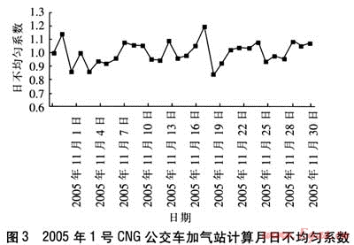 仍以1號CNG公交車加氣站為例,2005年該CNG公交車加氣站月高峰系數(shù)出現(xiàn)在2005年11月,該月的日不均勻系數(shù)見圖3。2005年該CNG公交車加氣站11月份的日高峰系數(shù)出現(xiàn)在2005年11月18日,數(shù)值為1.197;日不均勻系數(shù)的最小值出現(xiàn)在2005年11月19日,數(shù)值為0.841。