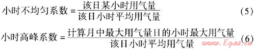 小時(shí)不均勻系數(shù)表示1d中小時(shí)用氣量的不均勻性,該日最大小時(shí)不均勻系數(shù)稱為小時(shí)高峰系數(shù)。小時(shí)不均勻系數(shù)和小時(shí)高峰系數(shù)的計(jì)算公式為: