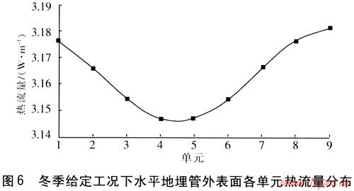 由圖6可知,地埋管外表面上各單元的熱流量并不是均勻分布的,象平面上的單元9熱流量最高,單元4、5熱流量最低,其他對(duì)稱單元(單元3與6、單元2與7、單元1與8)的熱流量相等。對(duì)應(yīng)到原平面上,即地埋管上部各單元的熱流量較高,下部各單元的熱流量較低,地埋管兩側(cè)各單元的熱流量沿原平面y軸對(duì)稱分布,對(duì)稱單元熱流量相等。地埋管底部單元(單元4、5)的熱流量最低,管道頂部單元(單元9)的熱流量最高。這是由于地埋管外表面沿圓周溫度不同,地埋管外表面各單元的熱流量也不等,即地埋管外表面熱流量分布是不均勻的。
