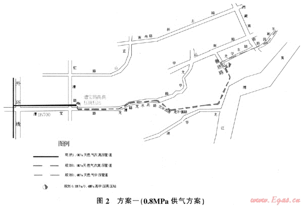 經(jīng)過與市規(guī)劃部門的征詢,認為該方案中初步確定的高壓站站址(龍華東路、魯班路口)無法實施,由于沒有管位,0.8MPa次高壓管道無法敷設(shè)到魯班路。
