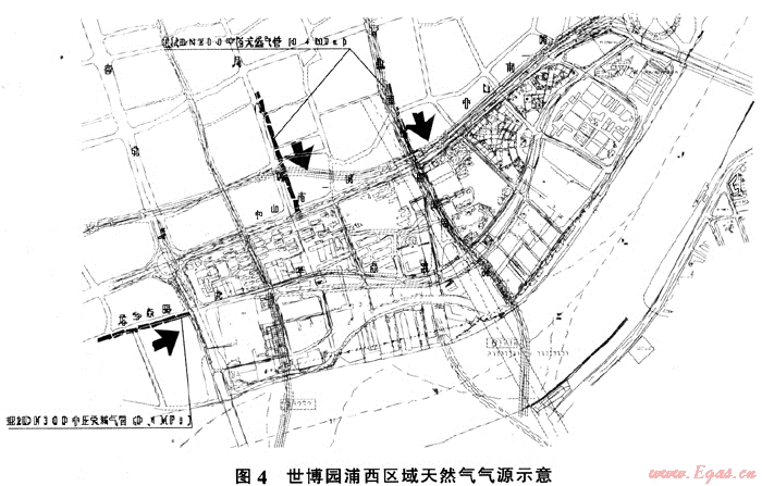 浦西世博園區(qū)天然氣氣源,由于受消防安全間距、管位、調(diào)壓站建設(shè)用地等條件的限制,規(guī)劃自漕寶路高中壓調(diào)壓站,延伸0.4MPa中壓管道至宜山路、斜土路,再從蒙自路、局門路、制造局路、西藏南路、保屯路以及南車站路路口接出,向園區(qū)的用戶供應(yīng)天然氣。