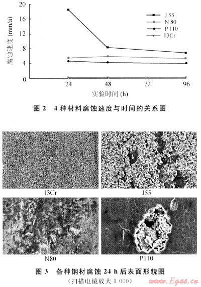 采用配制的實(shí)驗(yàn)溶液和制定的實(shí)驗(yàn)條件,對(duì)N80、J55、P110、13Cr 4種材質(zhì)進(jìn)行耐蝕性評(píng)價(jià),實(shí)驗(yàn)結(jié)果見(jiàn)圖2、3,可得出如下管材防腐性能結(jié)論: