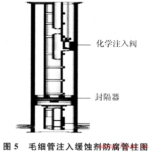 2) 對(duì)預(yù)期產(chǎn)量較低、腐蝕條件不苛刻、預(yù)期使用年限較短的井,則綜合考慮成本,采用國(guó)外常用的毛細(xì)管注入緩蝕劑(圖5)或國(guó)內(nèi)的光油管注入緩蝕劑的方式進(jìn)行防腐,地面采用泵注方法,根據(jù)現(xiàn)場(chǎng)監(jiān)測(cè)結(jié)果,確定緩蝕劑最佳加入濃度和加入周期等參數(shù)。