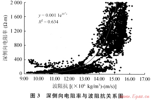 由圖3看出,區(qū)塊波阻抗與電阻率呈乘冪關(guān)系,波阻抗高值對應(yīng)電阻率高值,統(tǒng)計(jì)結(jié)果與地質(zhì)認(rèn)識吻合,擬合的關(guān)系式相關(guān)系數(shù)較高,可以滿足反演處理的要求。區(qū)塊波阻抗與RTC的統(tǒng)計(jì)關(guān)系不是很明顯,所以采用間接方式得到波阻抗與RTC的轉(zhuǎn)換關(guān)系。結(jié)果表明RTC反演與地質(zhì)情況吻合,擬合的相對關(guān)系式相關(guān)系數(shù)較好,完全能滿足反演處理的要求。