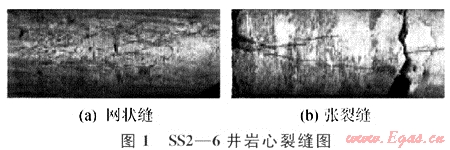 本次研究對研究區(qū)內(nèi)8口取心井目的層的裂縫發(fā)育狀況進(jìn)行了巖心觀察和描述。從研究區(qū)裂縫發(fā)育情況看,研究區(qū)天然裂縫發(fā)育,主要為構(gòu)造縫(張裂縫、網(wǎng)狀縫),其次為成巖縫(圖1)。