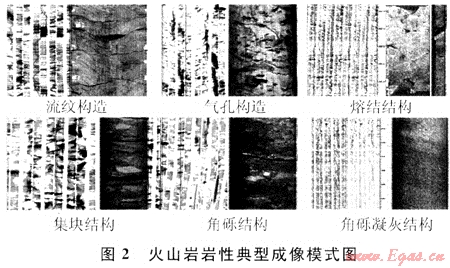 徐深氣田火山巖巖性成因復雜,即使巖石化學成分相同,但如果結(jié)構(gòu)、構(gòu)造不同,其巖石類型也會不同。而應(yīng)用交會圖版法雖然可以識別成分不同的巖性(如酸性巖、中性巖和基性巖等),但對于成分相同、而結(jié)構(gòu)或構(gòu)造不同的巖性如流紋質(zhì)熔結(jié)凝灰?guī)r、角礫凝灰?guī)r、火山集塊巖、火山角礫巖這些火山巖巖性識別效果較差,對這類巖性必須結(jié)合成像測井進行識別。圖2為火山巖典型成像模式圖。