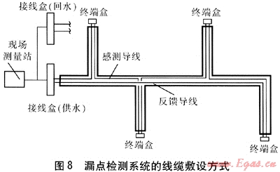 漏點檢測系統(tǒng)線纜敷設(shè)必須遵循以下原則:只有感測導(dǎo)線敷設(shè)至分支管,反饋導(dǎo)線不敷設(shè)到分支管。漏點檢測系統(tǒng)的線纜敷設(shè)方式見圖8,圖8僅為供水管道的線纜敷設(shè)方式,回水管道需另外敷設(shè)線纜。