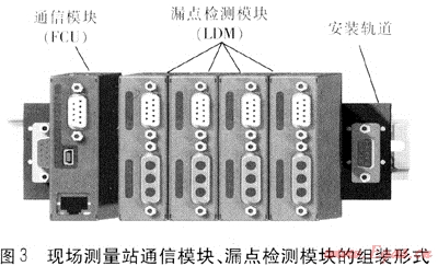 現(xiàn)場測量站通信模塊、漏點檢測模塊的組裝形式見圖3,所有模塊均安裝在軌道底板上,結(jié)構(gòu)簡單,安裝方便。漏點檢測模塊的作用是:測量管道與傳感器導(dǎo)線之間的阻抗;通過傳感器導(dǎo)線與其他漏點檢測模塊通信(采用管段兩端測量時);支持不同管段通信模塊間的數(shù)據(jù)傳輸;當有泄漏發(fā)生時,發(fā)出報警信號。