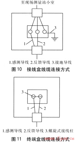 每一段檢測管段安裝一個接線盒,接線盒安裝在接地連接器上,接地導(dǎo)線與接地連接器連接,接地連接器焊接在管道上做到接地良好。接線盒經(jīng)連接電纜與現(xiàn)場測量站小室相連,接線盒線纜連接方式見圖10。在管段的末端安裝終端盒,將感測導(dǎo)線與反饋導(dǎo)線相連,終端盒線纜連接方式見圖11。