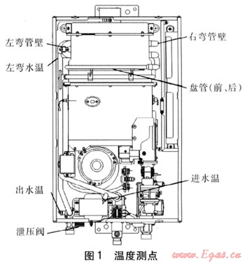 圖1為溫度測點,此外,還有室外溫度和熱水器周圍溫度(廚房、冷陽臺),其中左彎水溫、進(jìn)水溫、出水溫采用在水管上鉆孔將溫度探頭伸進(jìn)管中測水溫形式,其余各點則測水管外壁。