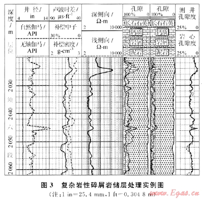 復(fù)雜巖性碳酸鹽巖儲(chǔ)層處理模塊是在雙礦物解釋程序發(fā)展起來的一個(gè)處理模塊,它考慮了中子曲線的含氣校正、聲波時(shí)差與孔隙度的非線性關(guān)系、巖性三角形的非正規(guī)排列等多個(gè)因素,使其更適用于一般碳酸鹽巖儲(chǔ)層的處理。