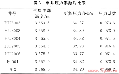 根據(jù)單井初期不穩(wěn)定試井資料,將氣井初期地層壓力折算至統(tǒng)一海拔深度,扣除投產(chǎn)時(shí)間晚2a的HU2005井和HU2006井,其余井壓力系數(shù)在0.9716~0.9736之間(表3),相對(duì)偏差較小,在0.05%~0.1%,說(shuō)明未投產(chǎn)前各井同屬一個(gè)壓力系統(tǒng)。