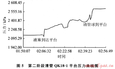 2010年2月5日開始第一階段清管,從QK18-1平臺(tái)發(fā)送專門研制的泡沫清管球,約4h后終端處理廠收到清管球,清除積液約20m3(該管道在2個(gè)月前有過清管,故積液量少于預(yù)測值)。幾天后進(jìn)行第二階段清管,從BZ13-1平臺(tái)發(fā)送清管球,710min后管道出口壓力開始上升,750min后過球指示器動(dòng)作顯示清管球到達(dá)?,F(xiàn)場根據(jù)壓力曲線估計(jì)液塞段體積約150m3,QK18-1平臺(tái)壓力曲線圖如圖5所示。隨后進(jìn)入第三階段清管,再從QK18-1平臺(tái)發(fā)送清管球,經(jīng)過260min收到清管球,通過渤西油氣處理廠測算收到積液127m3,部分液體經(jīng)過QK18-1平臺(tái)處理轉(zhuǎn)入輸油管道。此次作業(yè)共清除積液約170m3,取得了輸氣管網(wǎng)清管作業(yè)的成功。