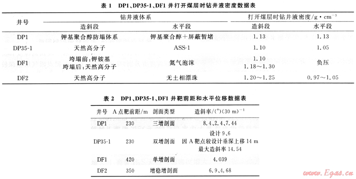 6) 調(diào)整了A點靶前距,有效降低DF2井鉆遇煤層段長。造成DF1井兩次埋鉆事故原因主要有以下幾個方面:①打開煤層時鉆井液密度不足以平衡煤層的垮塌應(yīng)力(表1為DP1井、DP35-1、DF1打開煤層時鉆井液密度數(shù)據(jù));②DF1造斜段煤層垮塌時采用倒裝鉆具組合,滑動鉆進后變復(fù)合鉆進時,由于鉆具撓動敲打,誘發(fā)煤層大量坍塌,造成突然坍塌埋鉆;③DF1井為長半徑水平井,A點靶前位移大,造斜率小,穿越煤層段長,累計煤層厚43m,單層最大厚度為25m(表2為DP1井、DP35-1、DF1、DF2井造斜段造斜率數(shù)據(jù))。
