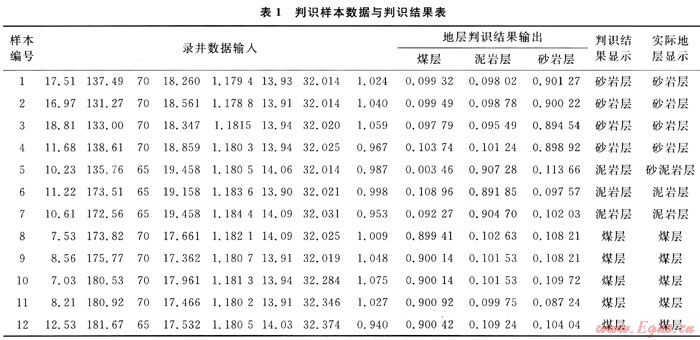 再選取學習樣本以外的12組數(shù)據(jù)作為待識別模式進行檢驗。按照2.1.2中步驟進行計算,將結果輸出(見表1)。由以上結果可見,在12組地層數(shù)據(jù)中,神經(jīng)網(wǎng)絡識別正確11組,準確度達到了91.7%,實現(xiàn)了對煤層的有效識別。