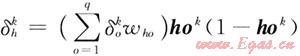 5) 隱含層到輸出層的連接權值who、輸出層的δok和隱含層的輸出向量hok結合,計算誤差函數(shù)對隱含層的各節(jié)點的偏導數(shù)δhk: