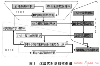 煤層實時識別是通過分析綜合錄井數(shù)據(jù)與地層巖性相對應的、具有特定規(guī)律的非線性關系,將其擬合處理成為線性表達式,通過計算實現(xiàn)地層的分類識別。但是反映地層差異的錄井參數(shù)眾多,而部分參數(shù)又難以準確測度,受人為干擾較大[5]。因此,解決煤層實時識別問題就需要選擇一種既具有實時性,又擅長解決規(guī)律隱含在大量數(shù)據(jù)中的映射逼近方法。而數(shù)學理論證明神經(jīng)網(wǎng)絡具有解決任何復雜非線性映射的能力,這使得它特別適合于煤層實時識別的問題[6]。神經(jīng)網(wǎng)絡在地層識別分析中的應用就是通過把鉆井過程中采集到的參數(shù)、工程計算結果作為輸入,建立適用于地層識別分析的神經(jīng)網(wǎng)絡模型作為推理機,網(wǎng)絡的輸出就是地層識別結果。通過對可靠歷史樣本數(shù)據(jù)的學習,不斷提高分析模型的擬合度,逼近實際鉆井過程地層變化狀況。煤層實時識別模型由模型建立、模型判識和校正分析3部分組成,如圖1所示。識別模型建立的實質(zhì)是調(diào)節(jié)BP神經(jīng)網(wǎng)絡各層節(jié)點的閾值和節(jié)點之間的連接權值以使網(wǎng)絡運算誤差不斷減小,直到達到設定的誤差允許范圍,從而使網(wǎng)絡學會并記憶給定的學習樣本集。模型判識的實質(zhì)就是將待判識的數(shù)據(jù)輸入訓練收斂的BP神經(jīng)網(wǎng)絡進行分析計算,從而對輸入數(shù)據(jù)進行分類識別。而校正分析模塊則是將網(wǎng)絡判識結果與實際結果對比,進行判識結果校正和學習樣本的實時提取。