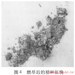混燒不僅改善了燃煤的著火性能,還改善了主燃區(qū)燃料層內(nèi)空氣與燃料的混合。秸稈壓塊在冷態(tài)情況下是致密的塊狀結(jié)構(gòu),受熱時(shí)揮發(fā)分析出,自身將成為疏松的孔狀結(jié)構(gòu),且膨脹、體積增大。由圖3可以觀察到燃料層表層的體積膨脹后的秸稈壓塊。燃盡后的秸稈壓塊見圖4,其結(jié)構(gòu)是疏松多孔狀的。