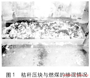 與煤混燒的是花生秧秸稈壓塊,其形狀為長方體,尺寸為30mm×30mm×70mm,運(yùn)輸過程造成少量壓塊破碎成小塊,但粉末狀顆粒所占比例可忽略。由于成型過程中添加劑的影響,秸稈壓塊中灰的質(zhì)量分?jǐn)?shù)約15%,低位發(fā)熱量約14562kJ/kg?;鞜^程中,秸稈壓塊與燃煤的摻混比例(質(zhì)量比)為20%~30%。采用人工摻混,煤斗內(nèi)的混合情況見圖1,兩者混合比較均勻。