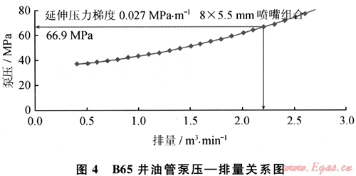 由于裂縫延伸壓力(pp)、管路摩阻(pf)、靜水柱壓力(pH)都是不難得到的參數(shù),因此,只要按照式(3)計(jì)算噴嘴壓降,就可以根據(jù)式(2)計(jì)算出施工時的地面泵壓。以B65井為例,得到油管泵壓 排量關(guān)系圖版(圖4)。