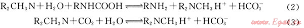 MDEA(R2CH3N)屬于叔胺,具有很強(qiáng)的選擇性,其溶液與C02反應(yīng)屬于慢反應(yīng)。為加快CO2吸收速率,在MDEA溶液中加入5%~10%的活化劑MEA(RNH2),其化學(xué)反應(yīng)按下式進(jìn)行[8]: