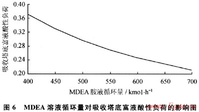 MDEA胺液循環(huán)量的大小不僅影響天然氣的凈化度,而且影響再生塔的熱負(fù)荷以及吸收塔底部的富液的酸性負(fù)荷(C02摩爾濃度與MDEA溶質(zhì)摩爾濃度的比值)。圖5給出了MDEA醇胺溶液循環(huán)量對(duì)再生塔底部再沸器熱負(fù)荷的影響。當(dāng)MDEA胺液循環(huán)量由700kmol/h減小到400kmol/h時(shí),對(duì)應(yīng)的再生塔底部再沸器熱負(fù)荷由796kW減小到476kW。因此,減少胺液循環(huán)量,能夠降低再沸器熱負(fù)荷,從而減少運(yùn)行成本。