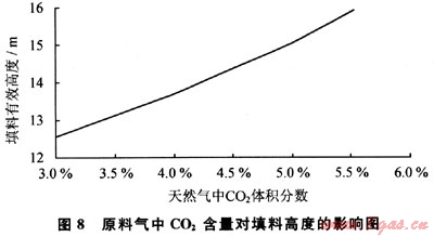 海上自升式移動(dòng)平臺(tái)一般由底艙、主甲板層、二層甲板層組成,其空間布局限制了海上橇裝油田伴生氣液化裝置的設(shè)計(jì)。油田伴生氣凈化系統(tǒng)中的吸收塔、再生塔作為液化裝置中最高的設(shè)備,其高度受到嚴(yán)格限制,一般要求不超過(guò)20m。因此,優(yōu)化吸收塔、再生塔高度,不僅能夠降低設(shè)備的投資,而且能夠降低海上移動(dòng)平臺(tái)設(shè)備的擺動(dòng),提高裝置運(yùn)行的穩(wěn)定性。圖8給出了在一定的胺液循環(huán)量條件下,進(jìn)吸收塔的原料氣中C02體積分?jǐn)?shù)對(duì)填料塔高度的影響。當(dāng)胺液循環(huán)量不變時(shí),減少進(jìn)入吸收塔的原料氣中C02含量,能夠有效降低填料塔高度。這是因?yàn)榘芬貉h(huán)量不變,C02含量降低時(shí),塔內(nèi)的醇胺溶液中C02含量降低,表面分壓降低,則較低的填料高度就能達(dá)到很高的凈化效果,因此能夠降低填料塔高度。同時(shí),一般情況下,富液的酸性負(fù)荷降低時(shí),胺液循環(huán)量也會(huì)適當(dāng)降低,從而降低再生塔能耗。
