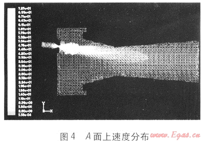 圖4為引射器A面上速度分布。燃?xì)庖砸欢ㄋ俣冗M(jìn)入引射管,燃?xì)饪勘旧淼哪芰课胍淮慰諝?,?jīng)過(guò)喉部后,在擴(kuò)壓管內(nèi)燃?xì)馀c空氣進(jìn)行能量、動(dòng)量交換,混合趨于均勻,速度趨于穩(wěn)定,兩者混合均勻后經(jīng)擴(kuò)壓管流出。