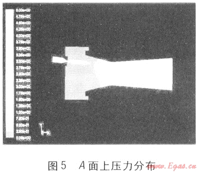 圖5為引射器A面上壓力分布。為了很好地顯示引射器內(nèi)部壓力狀況,著重體現(xiàn)了5Pa以下的壓力分布。在吸氣收縮管內(nèi)壓力接近于0Pa,與外界壓力相當(dāng)。經(jīng)過(guò)喉部,在擴(kuò)壓管部分壓力逐漸平穩(wěn)增加,而且每個(gè)橫斷面上的壓力分布非常均勻。最終在擴(kuò)壓管出口壓力達(dá)到5Pa,以克服氣流在燃燒器頭部的阻力。