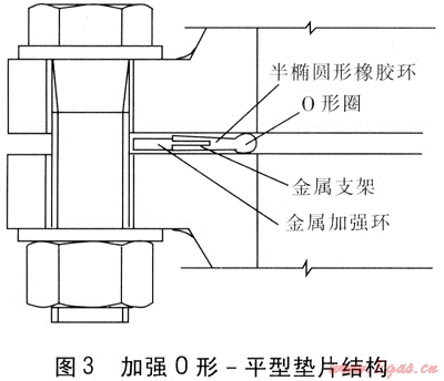 第3種結(jié)構(gòu)為加強(qiáng)0形-平型墊片,將上述第2種結(jié)構(gòu)的金屬骨架取消,在外側(cè)加裝金屬加強(qiáng)環(huán),見圖3。這種結(jié)構(gòu)的墊片由橡膠半橢圓形橡膠環(huán)、O形橡膠圈、金屬支架、金屬加強(qiáng)環(huán)組成,金屬支架與金屬加強(qiáng)環(huán)為一個(gè)整體,半橢圓形橡膠環(huán)與O形橡膠圈為一個(gè)整體,O形橡膠圈的直徑為半橢圓形橡膠環(huán)厚度的1.2~1.5倍。金屬加強(qiáng)環(huán)的厚度為半橢圓形橡膠環(huán)厚度的0.7倍。半橢圓形橡膠環(huán)外側(cè)的凹槽與金屬支架承插連接。推薦在4.0MPa設(shè)計(jì)壓力下使用這種結(jié)構(gòu)形式的墊片。