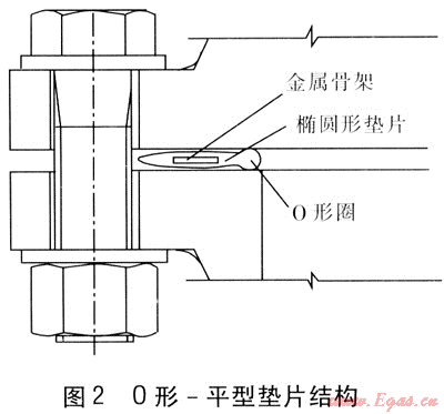 第2種結(jié)構(gòu)為O形-平型墊片,在平型墊片的斷面內(nèi)側(cè)邊緣連接有0形橡膠圈,見圖2。0形橡膠圈的直徑為橢圓形墊片厚度的1.2~1.5倍,可起到更好的密封效果。金屬骨架的橫截面為長方形,嵌裝在橢圓形橡膠墊片的中心部位。推薦在1.6MPa設(shè)計(jì)壓力下使用這種結(jié)構(gòu)形式的墊片。