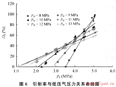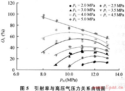 一般來說,隨著高壓氣壓力的增加,高壓氣流量增大,相應(yīng)的引射量(低壓氣流量)也增大。但當(dāng)聲。高于某特定值時,隨著高壓氣壓力的進(jìn)一步增大,噴嘴出口的壓力升高,低壓氣的進(jìn)氣壓力與噴嘴出口壓力的壓差減小,從而低壓流體的引射量減少。這表明在天然氣噴射裝置實際運行時,不能靠盲目提高高壓氣的進(jìn)氣壓力來增大低壓氣流量。