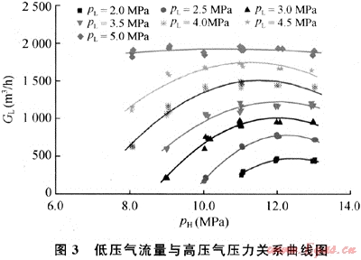 從圖3中可以看出,低壓氣流量與高壓氣壓力為非單調(diào)關(guān)系,隨高壓氣壓力的增大而先增大后減小。由該圖可知,當(dāng)高壓氣壓力(pH)為11~12MPa時,低壓氣流量的變化規(guī)律發(fā)生轉(zhuǎn)變,這與裝置設(shè)計工作壓力有關(guān)。