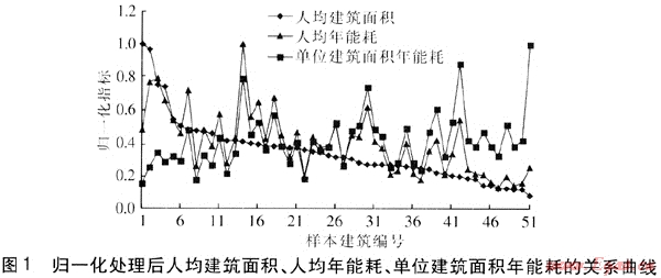 基于統(tǒng)計數(shù)據(jù)得到51幢樣本建筑的人均建筑面積、人均年能耗、單位建筑面積年能耗,為便于分析,對這3項數(shù)據(jù)進(jìn)行了歸一化處理。將51幢公共建筑按歸一化處理后的人均建筑面積由大到小進(jìn)行編號,三者的關(guān)系曲線見圖1。由圖1可知,隨著人均建筑面積的增加,人均年能耗呈現(xiàn)上升的趨勢,而單位建筑面積年能耗呈現(xiàn)下降的趨勢。