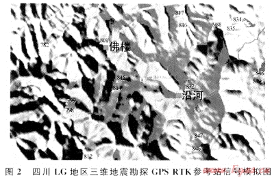 在GIS中利用數(shù)字高程模型,合理布設(shè)測(cè)量控制點(diǎn),提前進(jìn)行GPS基準(zhǔn)站的信號(hào)覆蓋情況模擬(圖2),并結(jié)合交通路線的分布情況,合理安排導(dǎo)線小組開始施測(cè)的位置,從而保證每個(gè)GPS施測(cè)小組在交通最方便的地方開始施測(cè)并能最大范圍地接收到來(lái)自GPS基準(zhǔn)站的GPS信號(hào)。如遇深溝或夾溝等信號(hào)盲區(qū),利用地形高差變化和交通情況,合理調(diào)配和架設(shè)中繼站,提高施測(cè)效率。