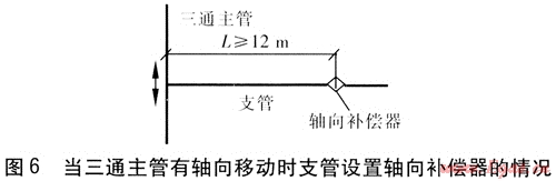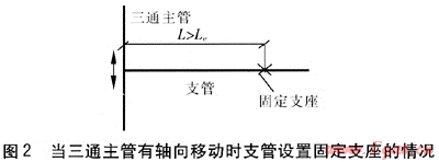 當(dāng)在支管上無(wú)法實(shí)現(xiàn)自然補(bǔ)償時(shí),可以考慮在支管上設(shè)置軸向補(bǔ)償器,軸向補(bǔ)償器的類型可根據(jù)供回水溫度、支管的管徑及其他技術(shù)要求選用。當(dāng)三通主管無(wú)軸向移動(dòng)時(shí),支管設(shè)置軸向補(bǔ)償器的情況見(jiàn)圖5。為了降低支管的軸向移動(dòng)對(duì)三通的推力,軸向補(bǔ)償器距三通的距離L應(yīng)滿足L≤20m[7]。