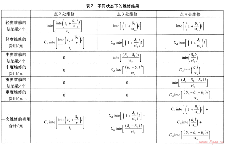 在表2中,因為檢測間隔以a為單位,所以將檢測間隔取整后,檢測間隔小于實際計算值,最大缺陷在檢測時沒有達到狀態(tài)點劃分的尺寸值,故對于點3處進行維修時,中度維修的最大缺陷為δx,δx由下式確定: