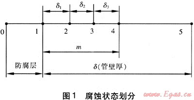 沿壁厚方向?qū)⑷毕莸陌l(fā)展劃分成4個階段,見圖1。在模型的實際應(yīng)用過程中,可根據(jù)實際供選擇的維修方式進行腐蝕階段和維修種類的劃分。用△δ表示缺陷的腐蝕深度,在圖1中的點4處,腐蝕深度達到最大,即δ1+δ2+δ3=m。