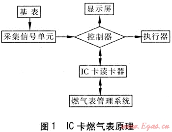 IC卡燃?xì)獗硎且阅な饺細(xì)獗頌橛?jì)量基表,以IC卡為媒體,加裝電子控制器所組成的一種有預(yù)付費(fèi)功能的燃?xì)庥?jì)量裝置。主要是由膜式燃?xì)獗?基表)、采集信號(hào)單元(量值傳感器、磁鋼)、控制器單元(計(jì)費(fèi)器)、執(zhí)行器(電磁閥等)、媒體(IC卡)、電源組成。用氣時(shí)基表數(shù)輪轉(zhuǎn)動(dòng),通過(guò)采集信號(hào)單元輸送脈沖信號(hào)到控制器上,利用IC卡完成與燃?xì)獗砉芾硐到y(tǒng)之間的數(shù)據(jù)交換,控制器對(duì)收到的數(shù)據(jù)、信號(hào)做出不同的反應(yīng)或發(fā)出指令,通過(guò)顯示屏顯示或?qū)?zhí)行器進(jìn)行開(kāi)閉控制,對(duì)數(shù)據(jù)實(shí)現(xiàn)雙向反映,從而達(dá)到燃?xì)獗碜詣?dòng)計(jì)量控制[1]。具體原理見(jiàn)圖1。