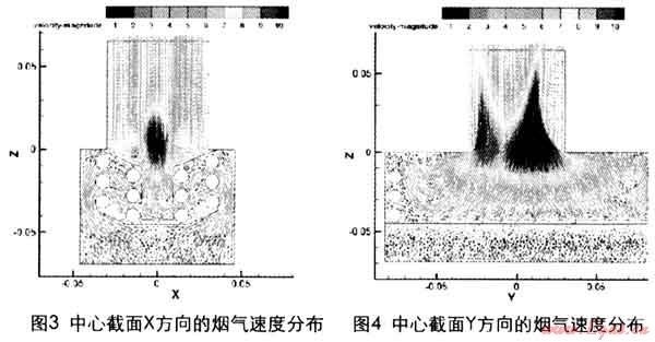 兩個垂直的中心截面沿X方向和Y方向的煙氣速度分布如圖3和圖4。從圖中可以看出流過換熱管的煙氣速度總體還比較均勻,下部換熱管由于阻力較大因而速度稍小。在排煙管的中心區(qū)域,由于截面收小,所以氣流速度較大。但到出口處基本上混合均勻。計算得到煙氣進口的平均速度為1.11m/s,煙氣出口的平均速度為5.37m/s。