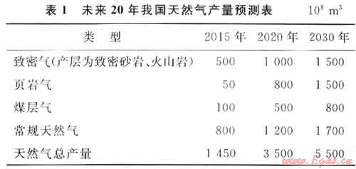 初步預(yù)計(jì),未來(lái)10~20年,非常規(guī)天然氣產(chǎn)量將顯著增長(zhǎng),成為全國(guó)天然氣儲(chǔ)量、產(chǎn)量增長(zhǎng)的主要來(lái)源之一,對(duì)保障全國(guó)天然氣供應(yīng)將起到日益重要的作用。2015年全國(guó)天然氣產(chǎn)量將達(dá)1450×108m3,其中非常規(guī)天然氣產(chǎn)量為650×108m3,約占當(dāng)年全國(guó)天然氣總產(chǎn)量的45%;2020年全國(guó)天然氣產(chǎn)量將達(dá)3500×108m3,其中非常規(guī)天然氣產(chǎn)量占到66%;2030年全國(guó)天然氣總產(chǎn)量將達(dá)到5500×108m3,其中非常規(guī)天然氣產(chǎn)量約占70%(表1)。