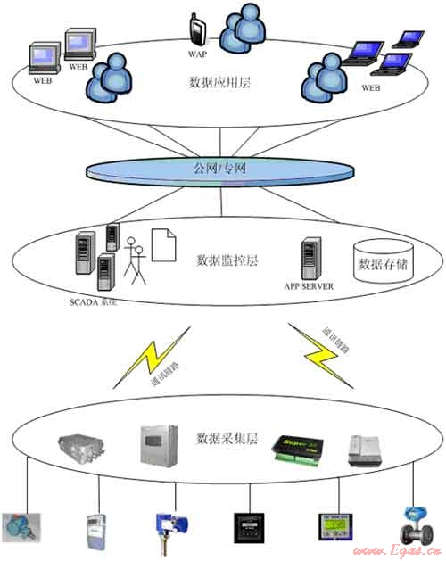 通用SCADA系統(tǒng)可分為3層。第1層為數(shù)據(jù)采集層,由RTU與一次儀表構成,完成現(xiàn)場原始數(shù)據(jù)的采集與預處理。根據(jù)設計需求還可以實現(xiàn)現(xiàn)場的數(shù)據(jù)存儲,以保證通訊中斷后數(shù)據(jù)的連續(xù)性;第2層為數(shù)據(jù)監(jiān)控層。在這層將利用各種軟件遠程仿真現(xiàn)場,實現(xiàn)數(shù)據(jù)的實時監(jiān)控、實時報警。該層可根據(jù)對應的管理模式再分為分控中心、總控中心等,還可根據(jù)設計需求進行大量歷史數(shù)據(jù)的存儲;第3層為數(shù)據(jù)應用層。在應用層實現(xiàn)對已采集數(shù)據(jù)的分析、整理,并根據(jù)需要實現(xiàn)多種形式的發(fā)布。業(yè)界很多公司分別在數(shù)據(jù)采集層、數(shù)據(jù)監(jiān)控層、數(shù)據(jù)應用層都擁有極其穩(wěn)定的產品和豐富的系統(tǒng)集成經驗。